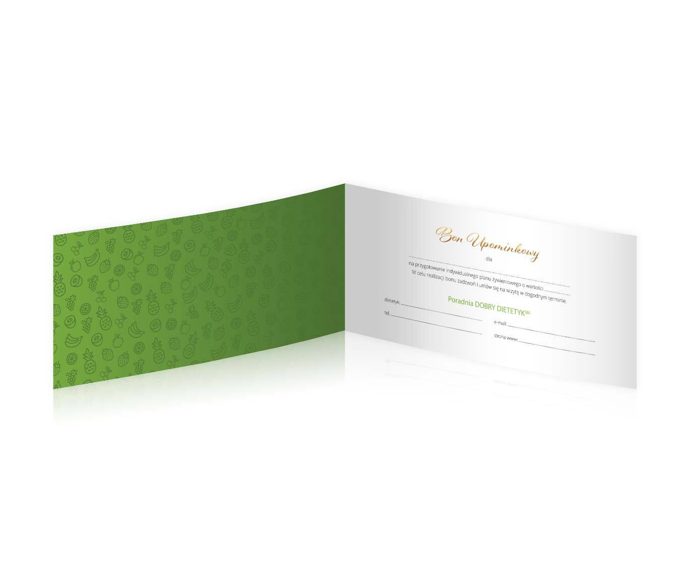 - Bon upominkowy na wizytę w gabinecie dietetycznym wraz z opracowaniem indywidualnego programu żywieniowego